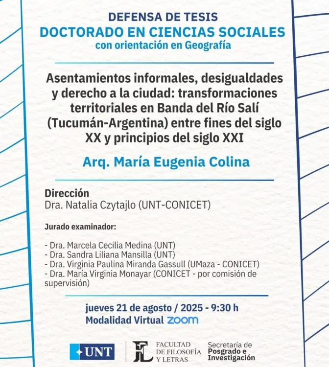 DEFENSA DE TESIS «Asentamientos informales, desigualdades y derecho a la ciudad: transformaciones territoriales en Banda del Río Salí (Tucumán-Argentina) entre fines del siglo XX y principios […]