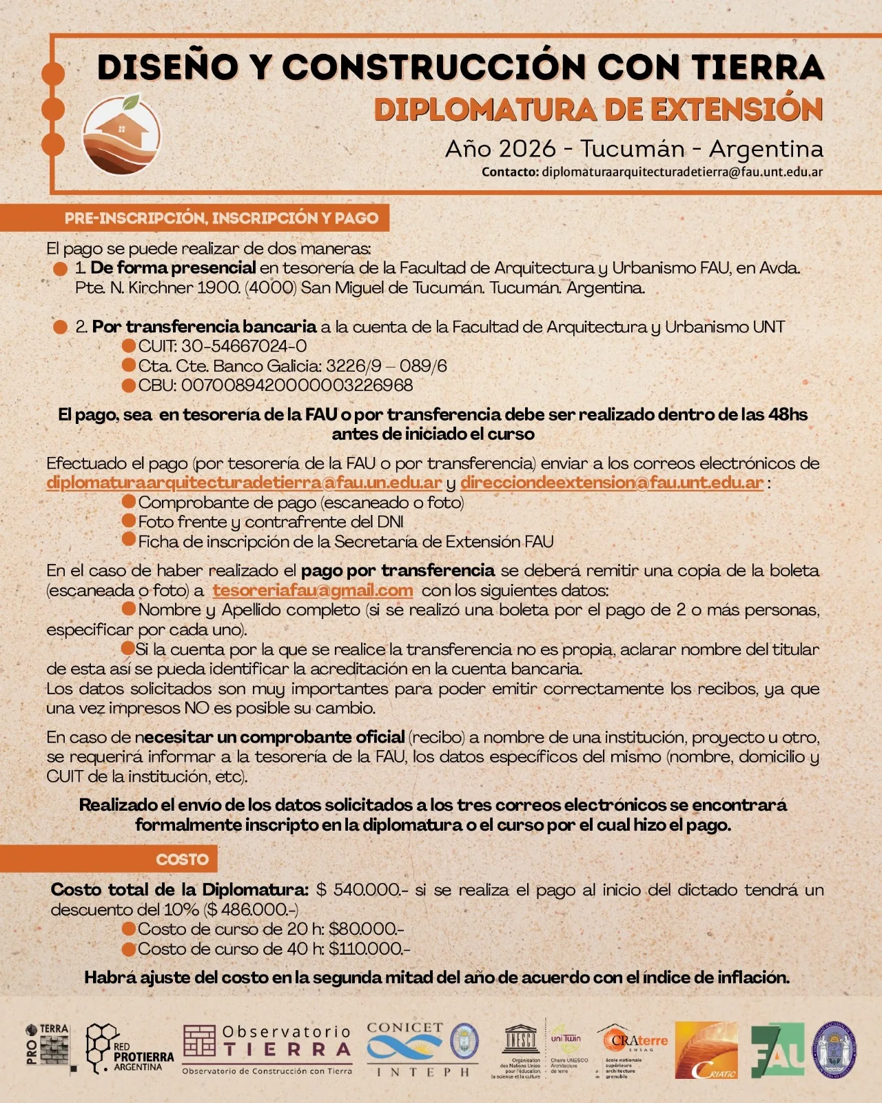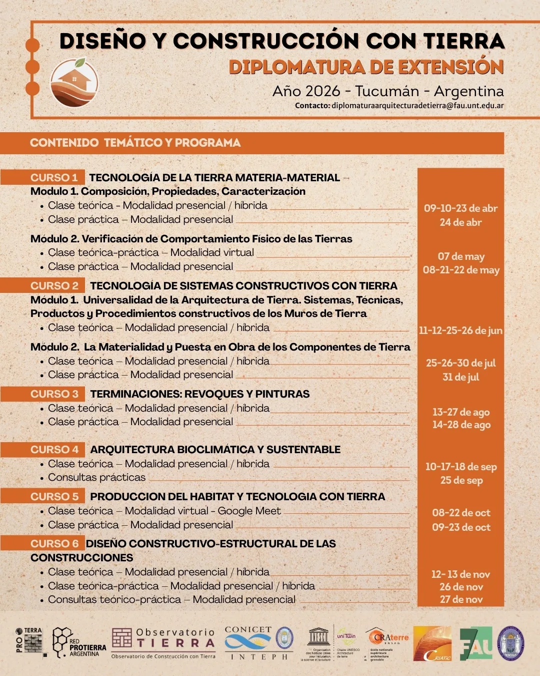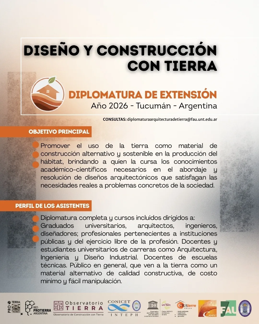 La Diplomatura de Extensión “Diseño y Construcción con Tierra” (2026) propone una formación orientada a promover el uso de la tierra como material de construcción alternativo y sostenible en la producción del hábitat. A lo largo del cursado, los participantes incorporarán conocimientos académico-científicos vinculados al diseño arquitectónico y a las técnicas constructivas con tierra, con el objetivo de abordar problemáticas reales y desarrollar soluciones acordes a las necesidades de la sociedad.