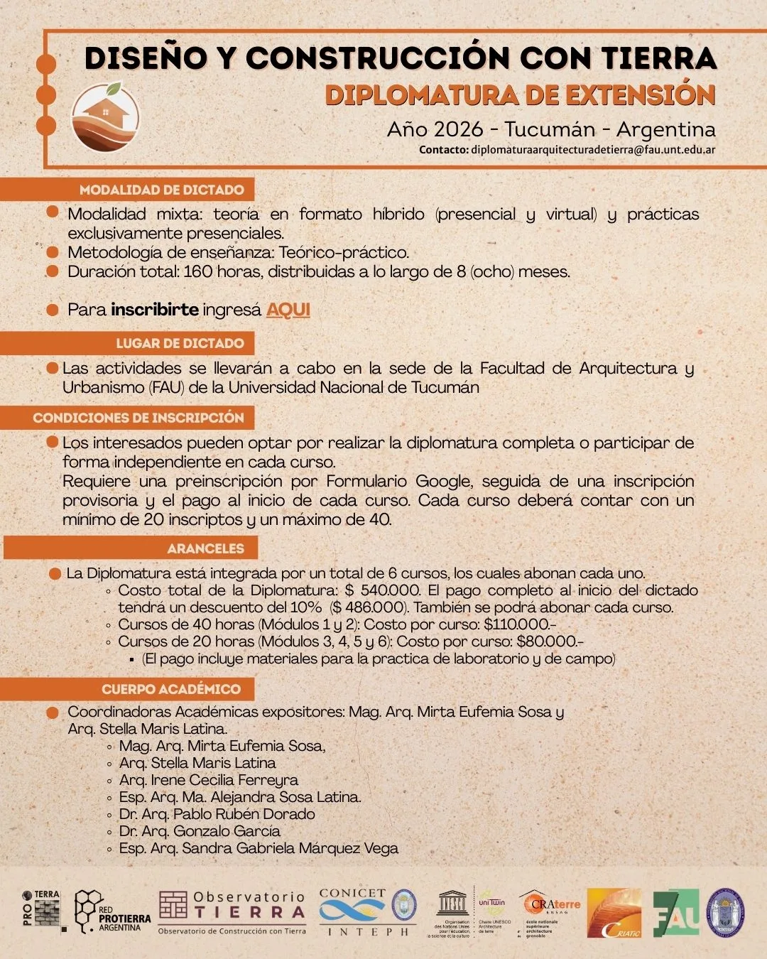 👥 DESTINATARIOS: Dirigida a graduados universitarios y estudiantes interesados en el diseño y construcción con tierra. Arquitectos, ingenieros, diseñadores; profesionales y técnicos pertenecientes a instituciones públicas y del ejercicio libre de la profesión. Docentes universitarios que deseen fortalecer o ampliar su conocimiento en el tema. Docentes de escuelas técnicas interesados en incluir el tema tierra en la materia Tecnología de los materiales. Público en general.