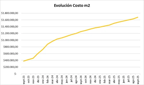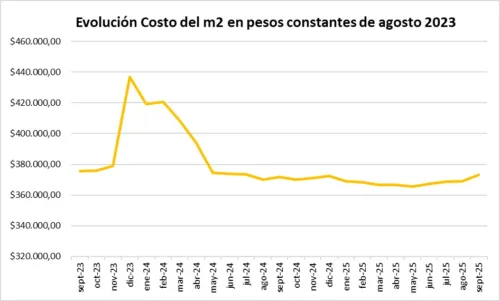 Al analizar la evolución del costo del metro cuadrado en pesos constantes de agosto de 2023, entre mayo de 2024 y septiembre de 2025, se observa una trayectoria mayormente estable en términos reales. A partir de mayo de 2025 comienzan a registrarse incrementos mensuales leves, que llevan los valores de agosto a equipararse con los de enero del mismo año. No obstante, en septiembre se advierte una suba más marcada, alcanzando niveles comparables a los de diciembre de 2024.