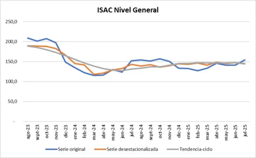 En julio de 2025, el ISAC presenta una suba de 1,4% con respecto a igual mes de 2024. El acumulado de los siete primeros meses del índice serie original presenta un aumento de 9,2% respecto al mismo período de 2024.