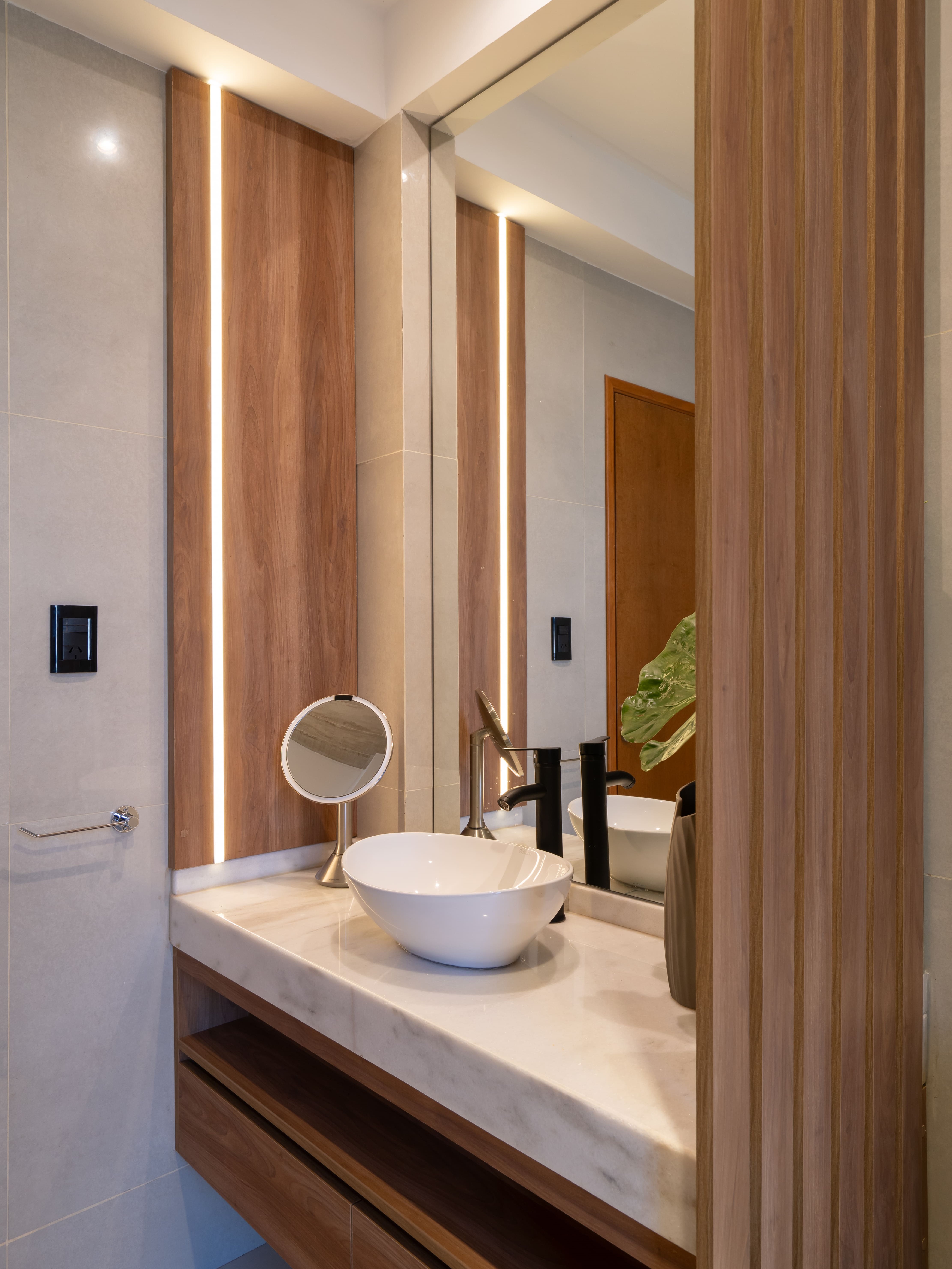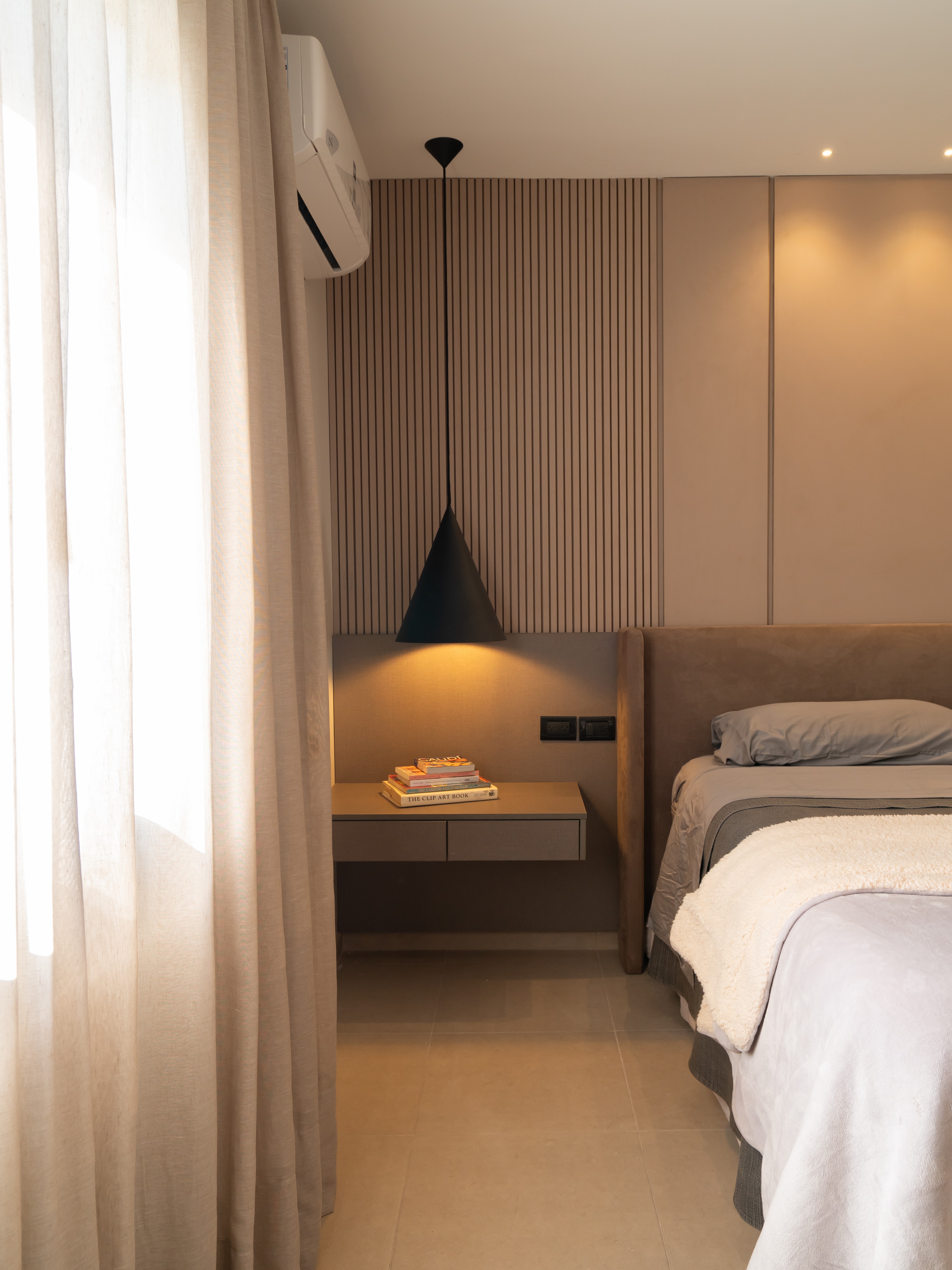 Revestido en su gran mayoría con placas decorativas en tonos neutros se logró una máster suite que invita al descanso considerando como principal objetivo la elegancia y el confort. Se sectorizo con estantería abierta para guardado y un espacio para make up con espejo convirtiendo el espacio en un fabuloso punto focal. La iluminación refuerza la función de cada sector.