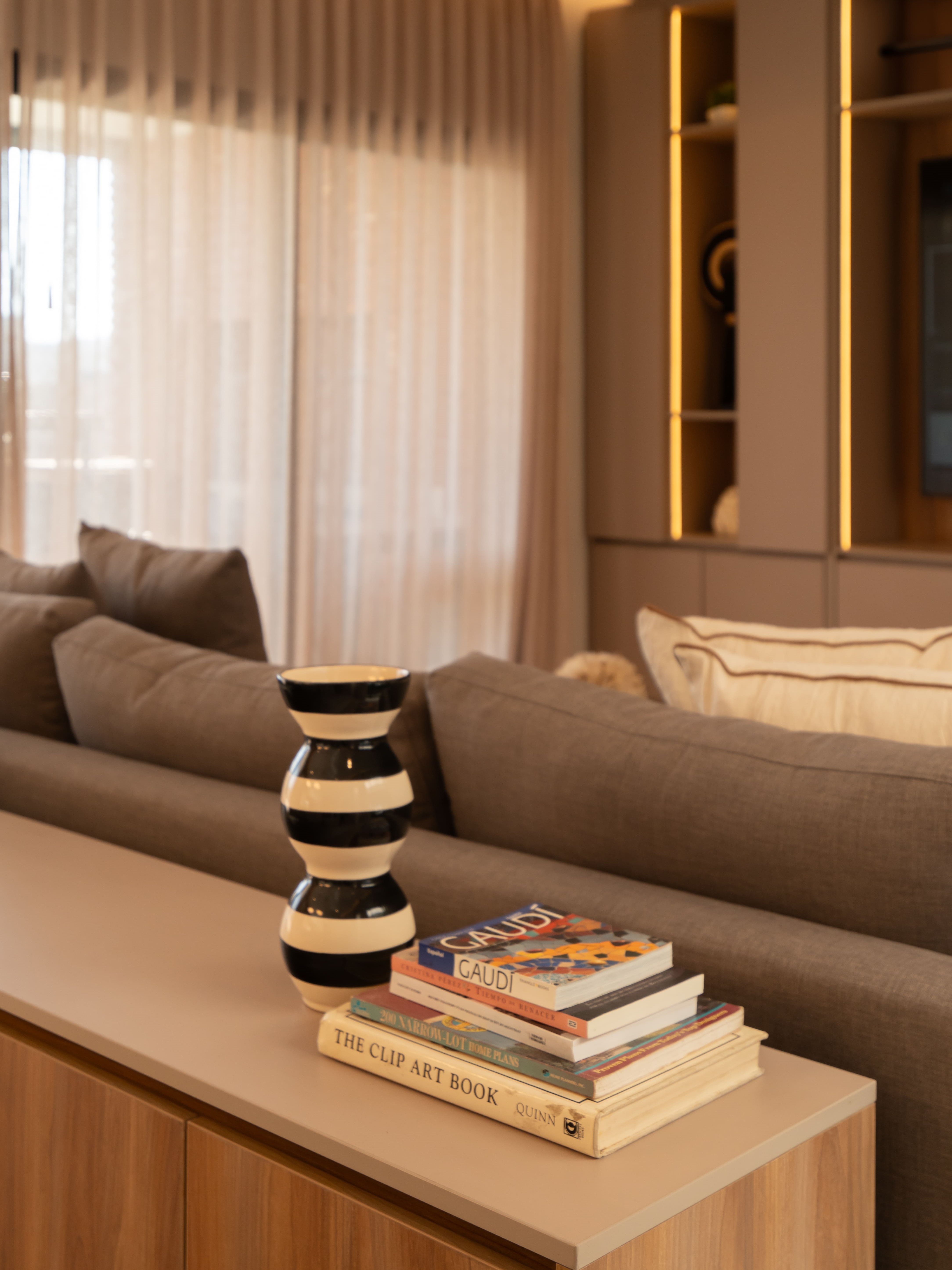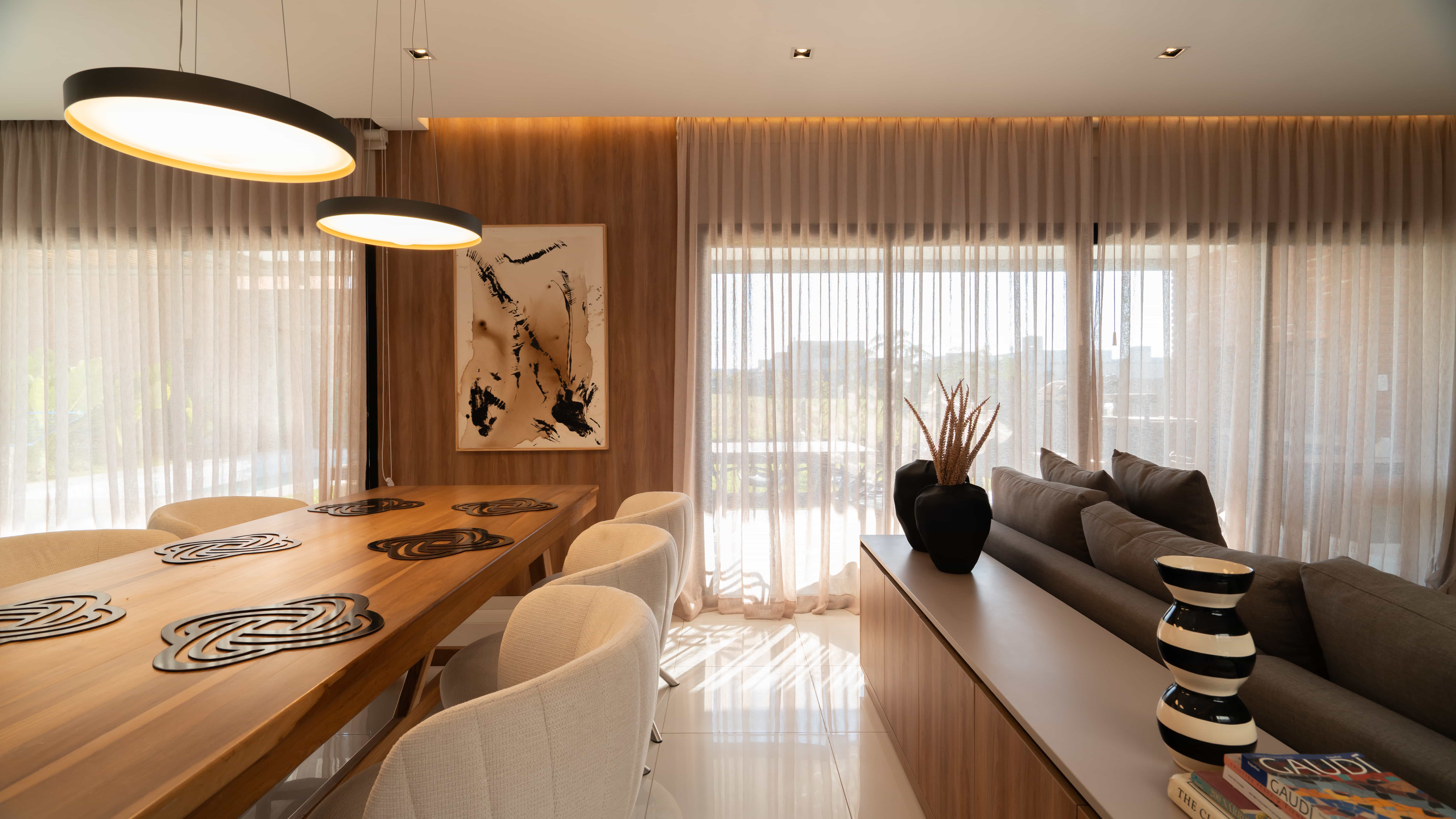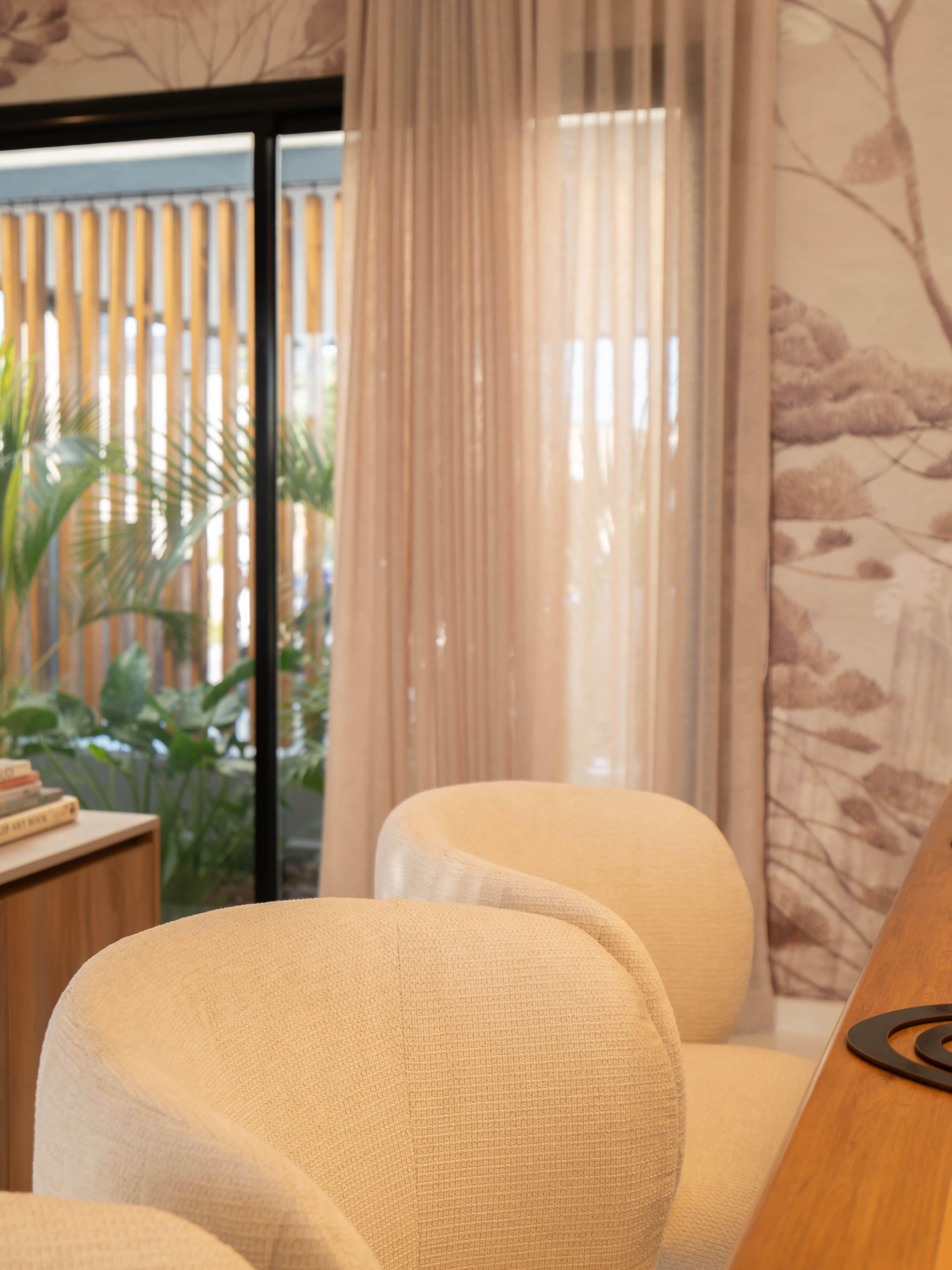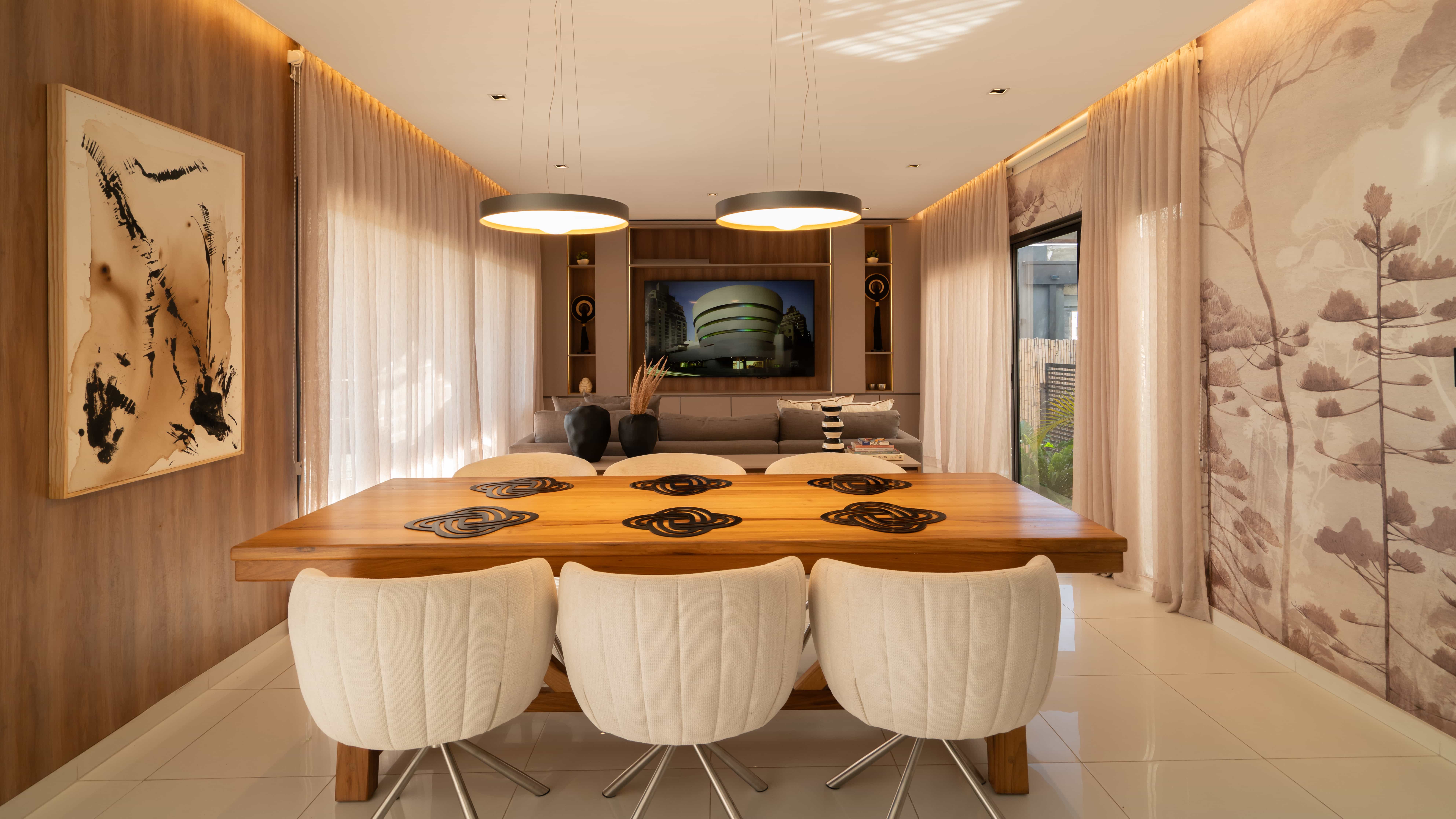Con especial énfasis en los espacios sociales, se eligió un papel en tonos sepia que remite un tranquilo paisaje con la intención de incorporar la naturaleza dentro de la casa. Acompañan a este proyecto materiales nobles y cálidos como la madera natural incorporando la novedad de sillas giratorias en sector comedor para más comodidad. El mueble del TV abarca toda la pared siendo protagonista de piso a techo e incorporando estética a la vez que espacio de guardado.