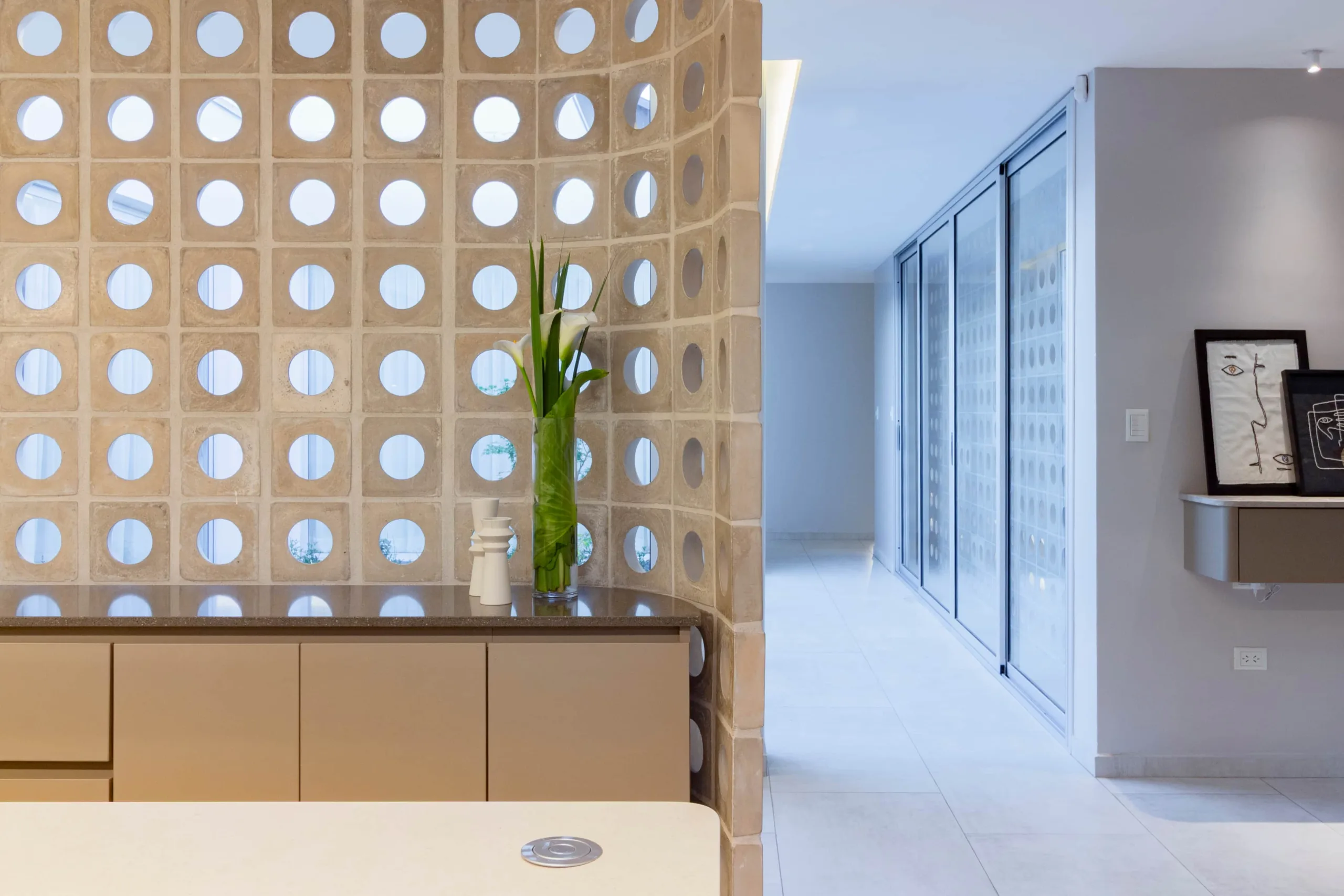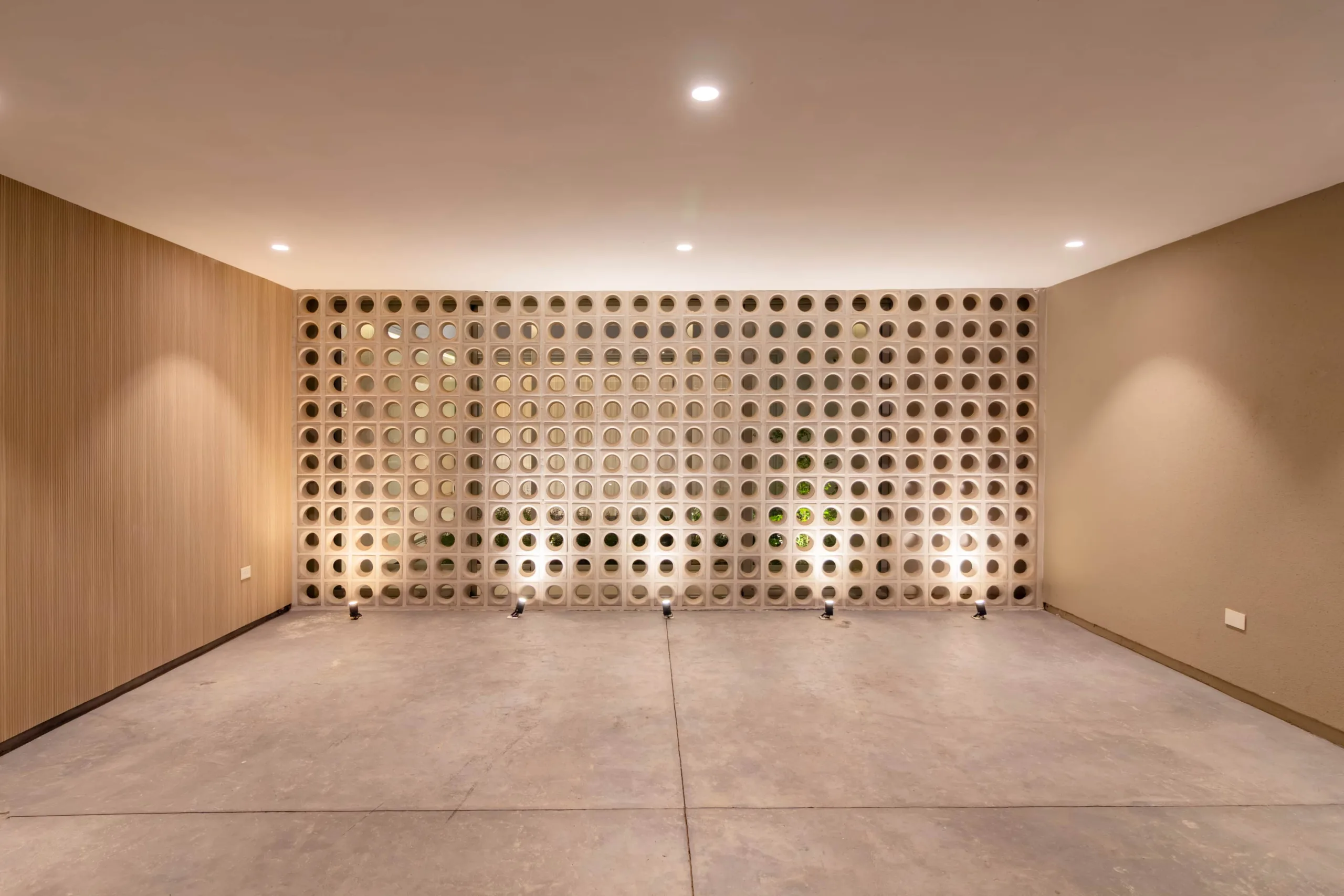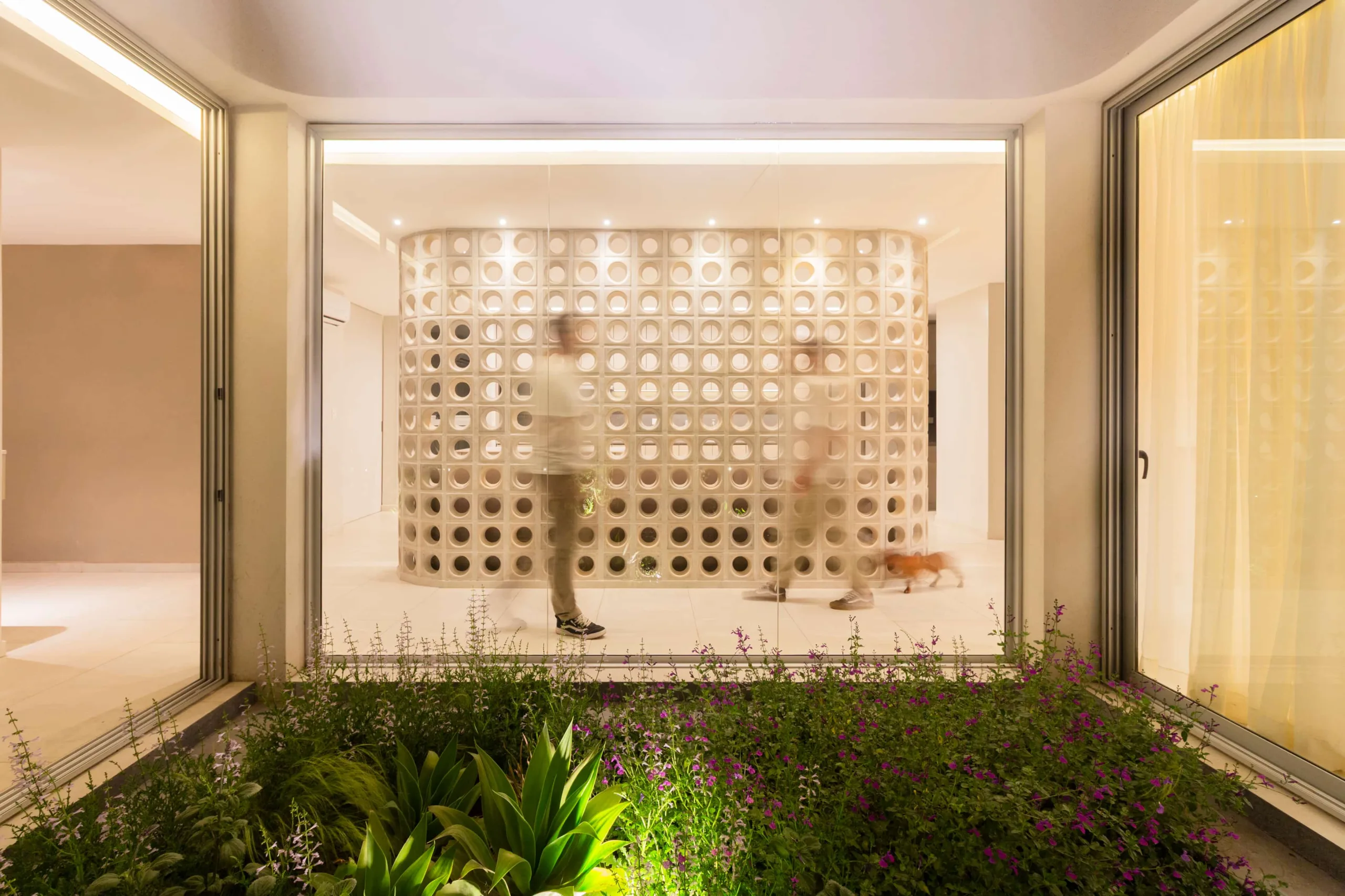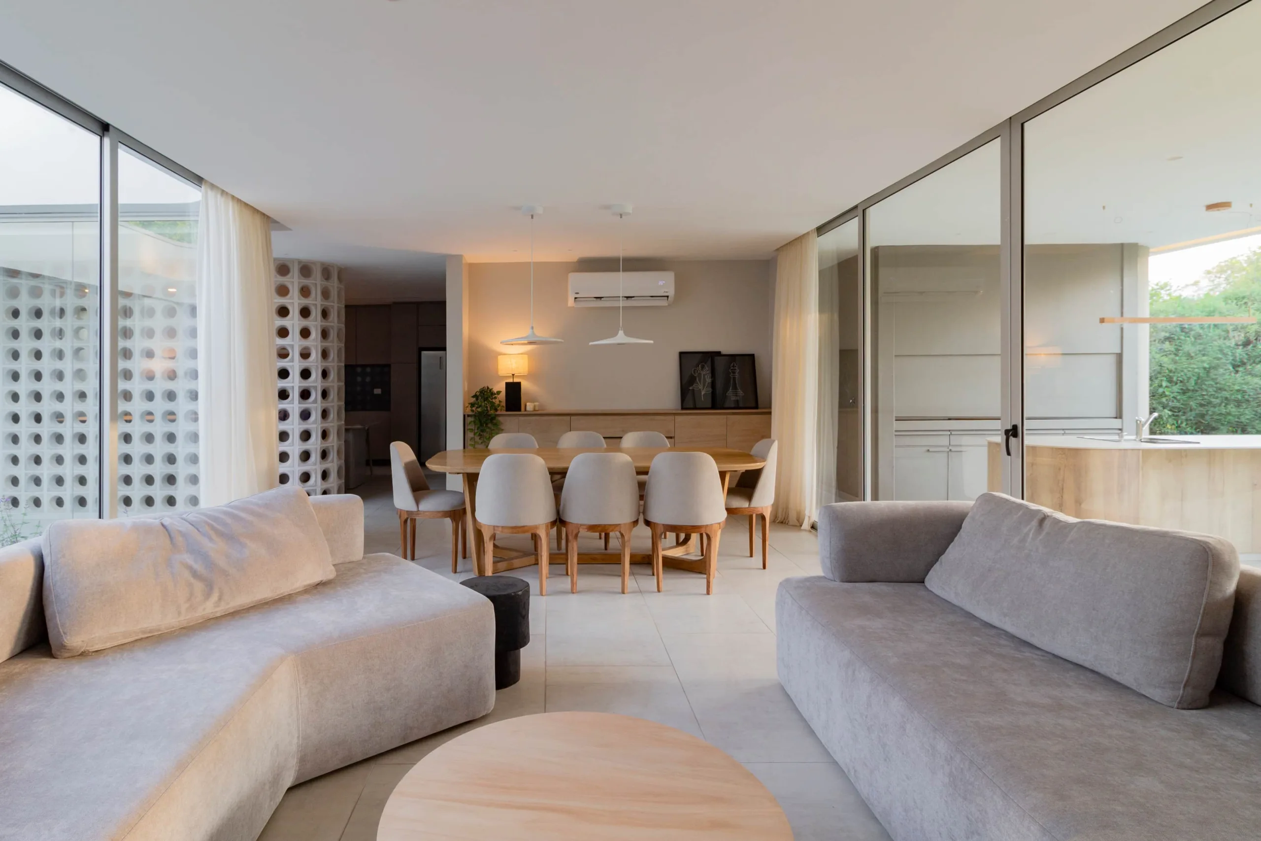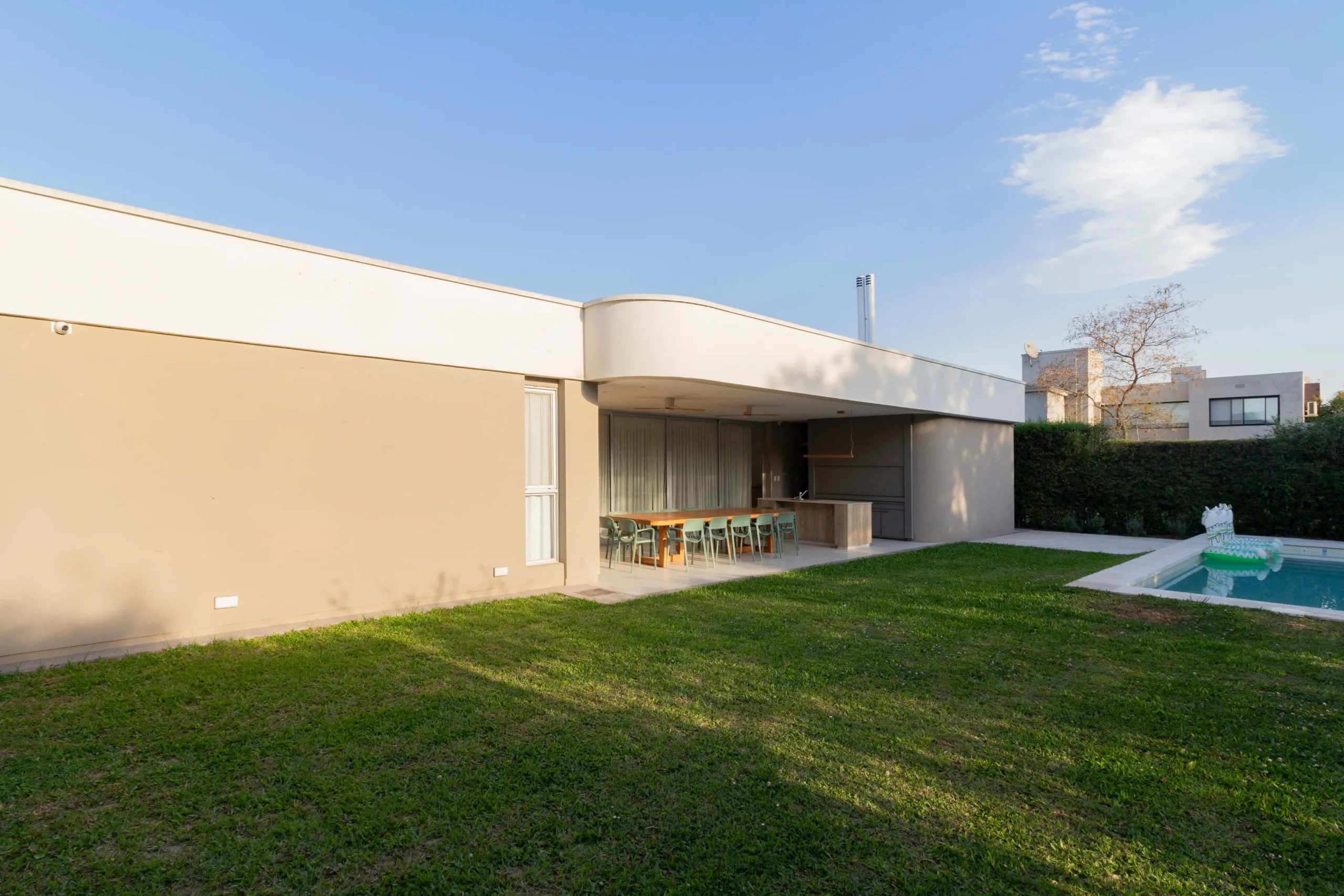 De estilo contemporáneo, la paleta de materiales exteriores está resuelta en colores claros, texturas rugosas, revestimientos de wpc y cobogós circulares como elementos destacados. La curvatura de sus muros y vigas invitan a ingresar. La vida de la casa gira en torno a un patio central. Una vez dentro de la vivienda su esquema de partido se entiende rápidamente, con los sectores social y privado bien diferenciados.