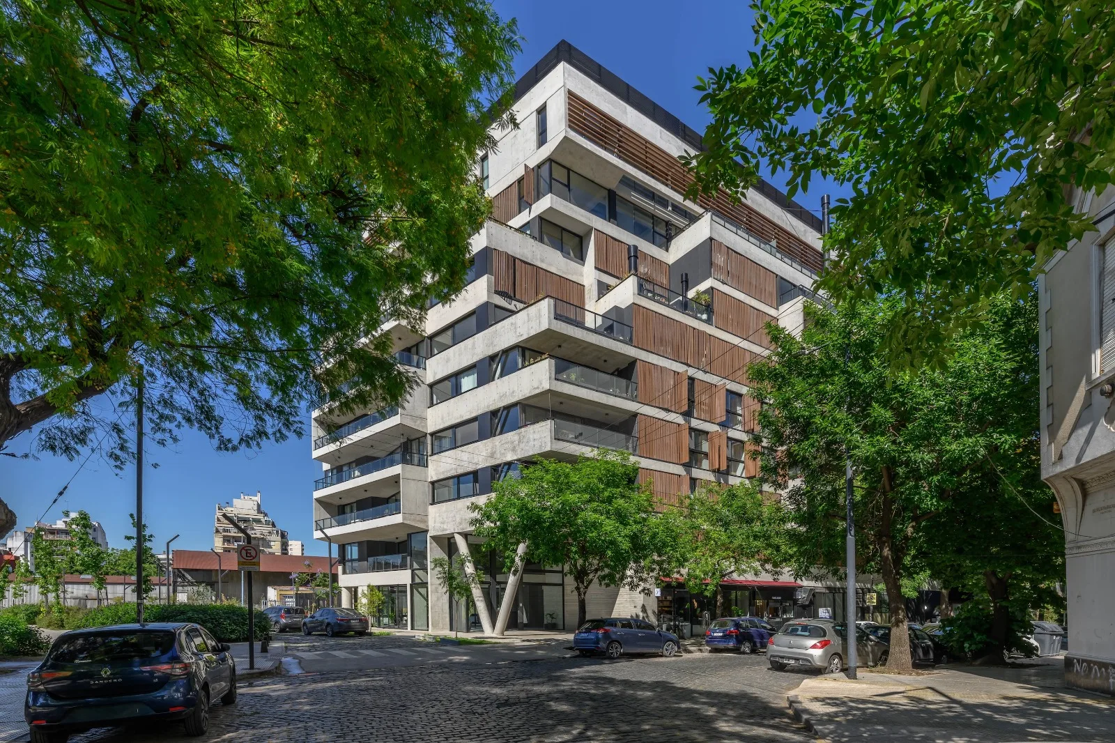 Un edificio que dialoga con el parque, proponiendo un zócalo comercial vital para la vereda. En los pisos superiores, se desmaterializa en una proa que arma terrazas diversas, de proporciones ambiciosas que inspiran a pasar más horas en los “afuera” de nuestras ciudades.