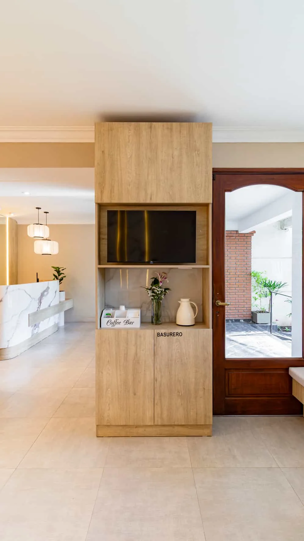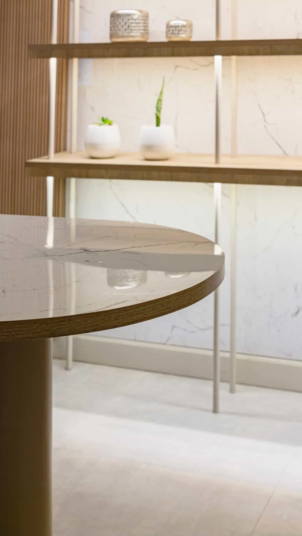 Desde el ingreso, el mostrador de recepción —de geometría curva y revestimiento simil marmol siguiendo la curva realizada con una lamina PET— se convierte en el elemento central del espacio. Detrás, un panel de listones verticales retroiluminados enmarca la identidad gráfica del centro y aporta profundidad visual mediante una iluminación cálida e indirecta y potencia el espacio 2 lamparas colgantes de diseño.