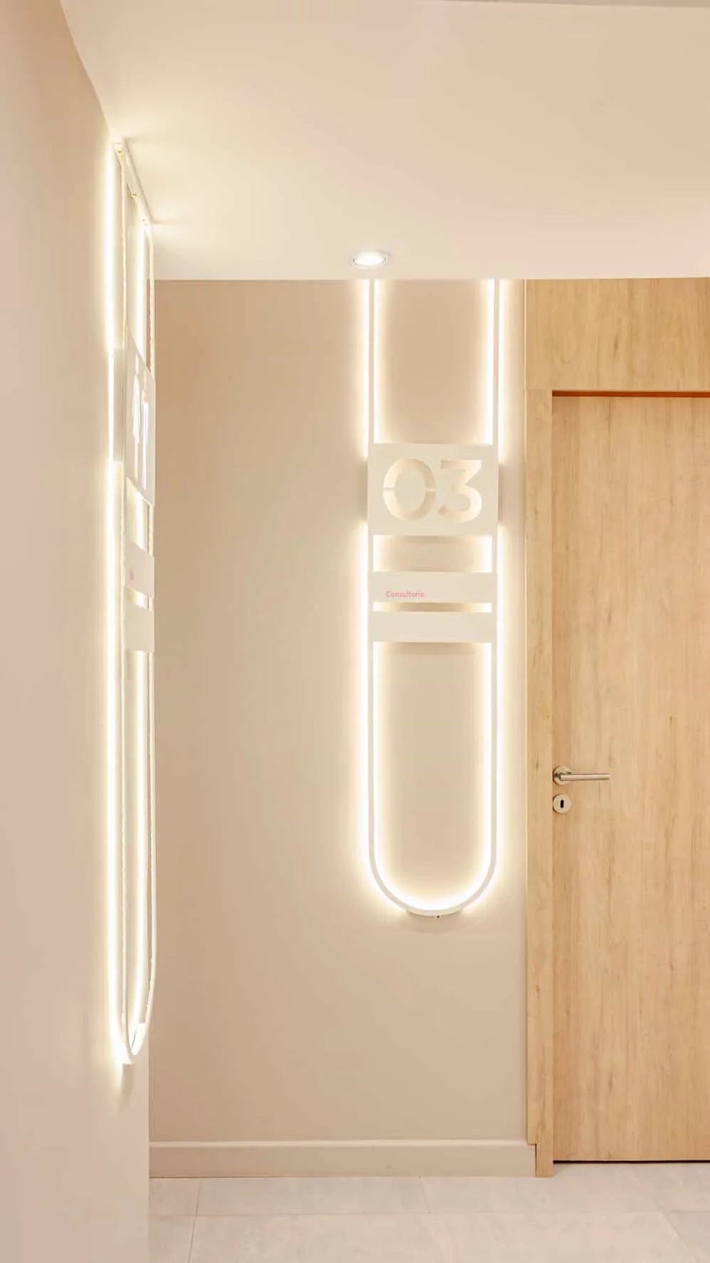 La propuesta se completa con un sistema de señalética especialmente diseñado para el proyecto, donde la cartelería se integra a la arquitectura como parte del lenguaje espacial. Piezas verticales retroiluminadas acompañan el recorrido de circulación, combinando numeración de consultorios, nombres de profesionales e iconografía sanitaria. Las formas curvas y la iluminación perimetral retoman el mismo gesto formal presente en otros elementos del interior, generando continuidad visual y facilitando la orientación dentro del centro. De este modo, la señalética no solo cumple una función informativa, sino que también se convierte en un recurso de diseño que refuerza la identidad del espacio.