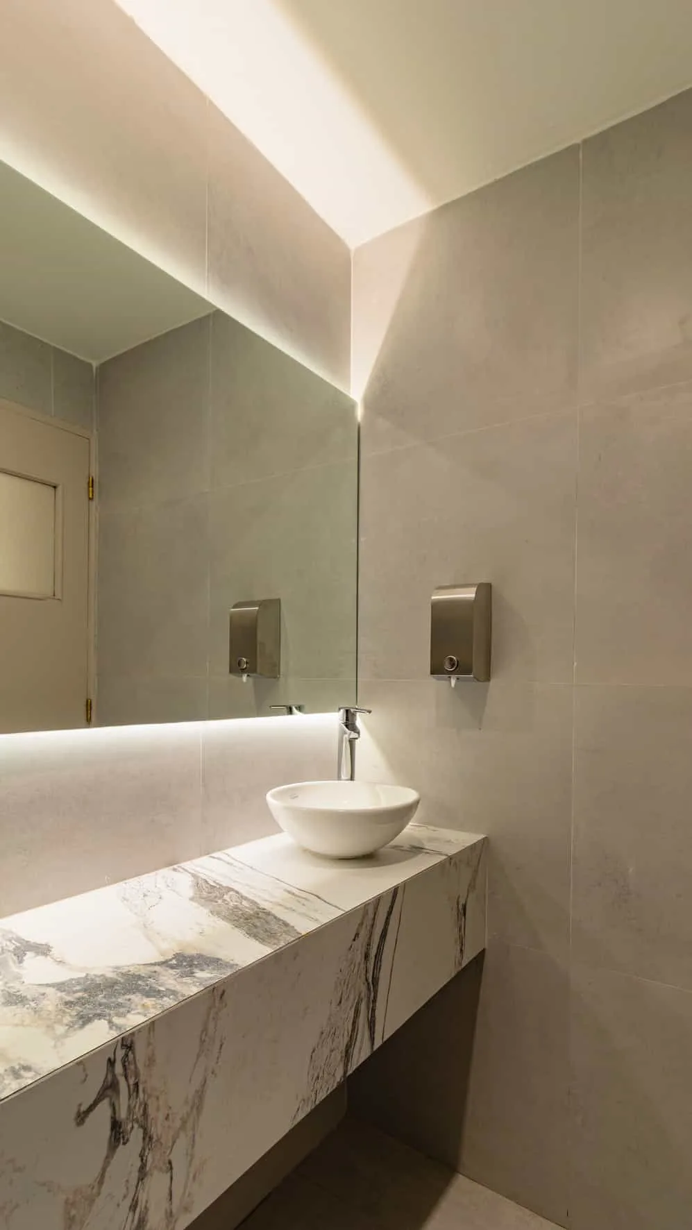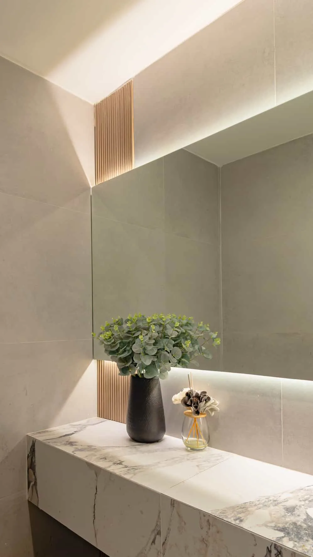 Los sanitarios continúan la lógica material presente en todo el proyecto. Mesadas suspendidas revestidas en superficies pétreas de gran formato se combinan con bachas apoyadas y griferías de líneas simples, generando una estética limpia y contemporánea. Los espejos de gran dimensión con iluminación perimetral refuerzan la sensación de amplitud y aportan una luz difusa que suaviza el espacio. Revestimientos neutros y detalles en madera terminan de construir una atmósfera cálida y cuidada.