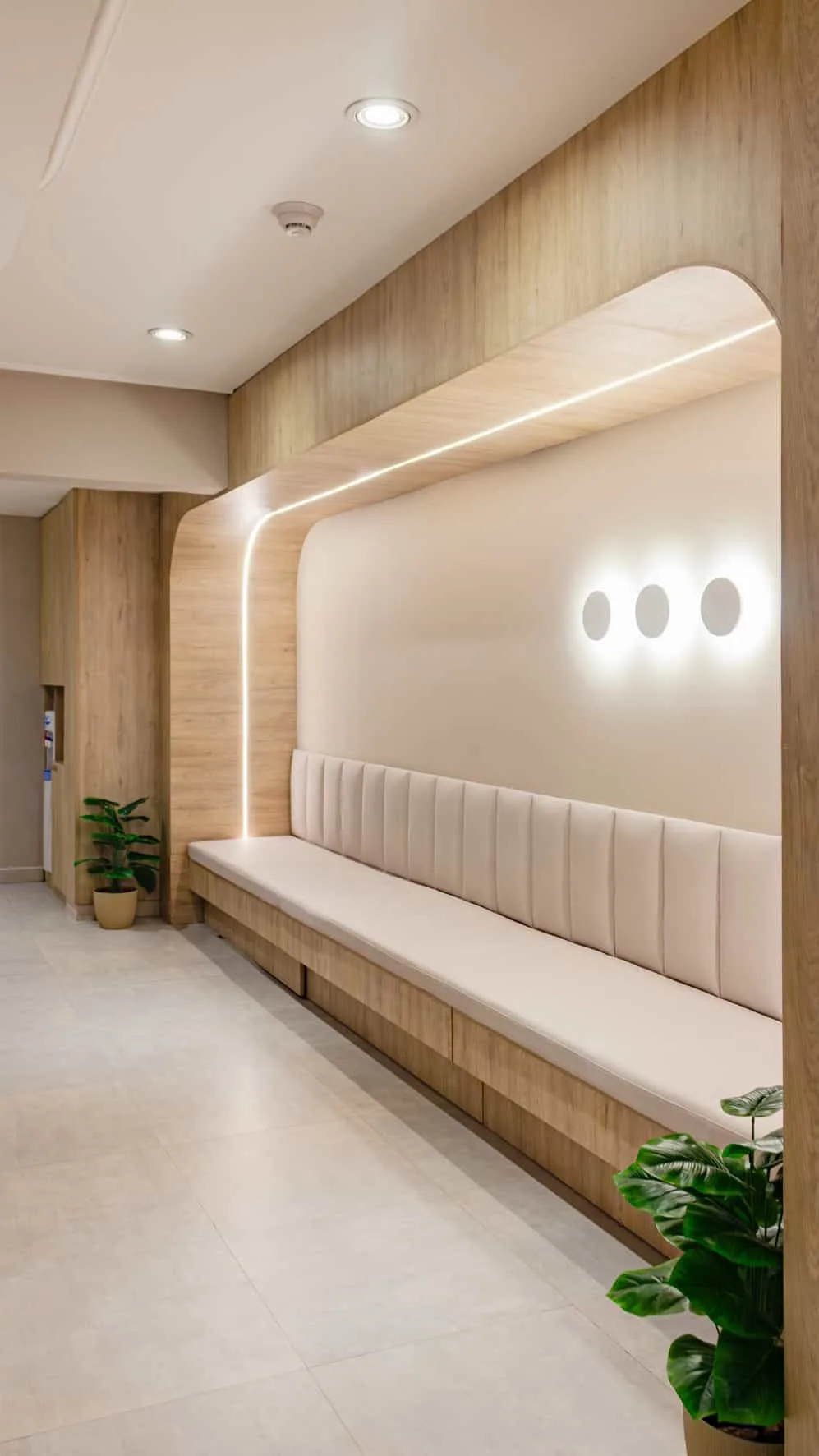 Las salas de espera se resuelven mediante bancos continuos integrados a la arquitectura, de madera clara, acompañado por paneles iluminados que generan ritmo y profundidad en el muro. La elección de materiales cálidos y la iluminación indirecta contribuyen a crear un ambiente tranquilo, pensado para disminuir la ansiedad propia de los espacios de atención médica. Acompañan el espacio asientos cómodos con textiles resistentes, sin perder elegancia, y un sector de servicio para café diseñados especialmente para este fin.