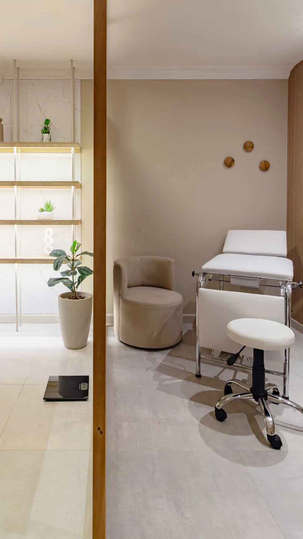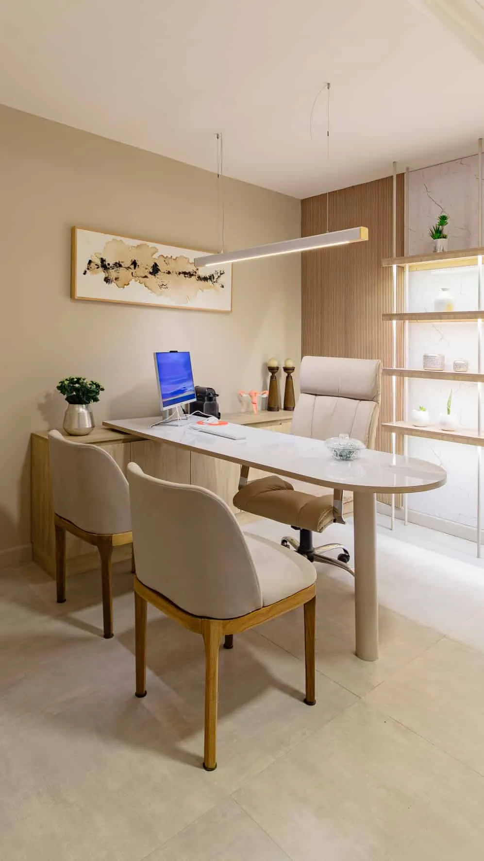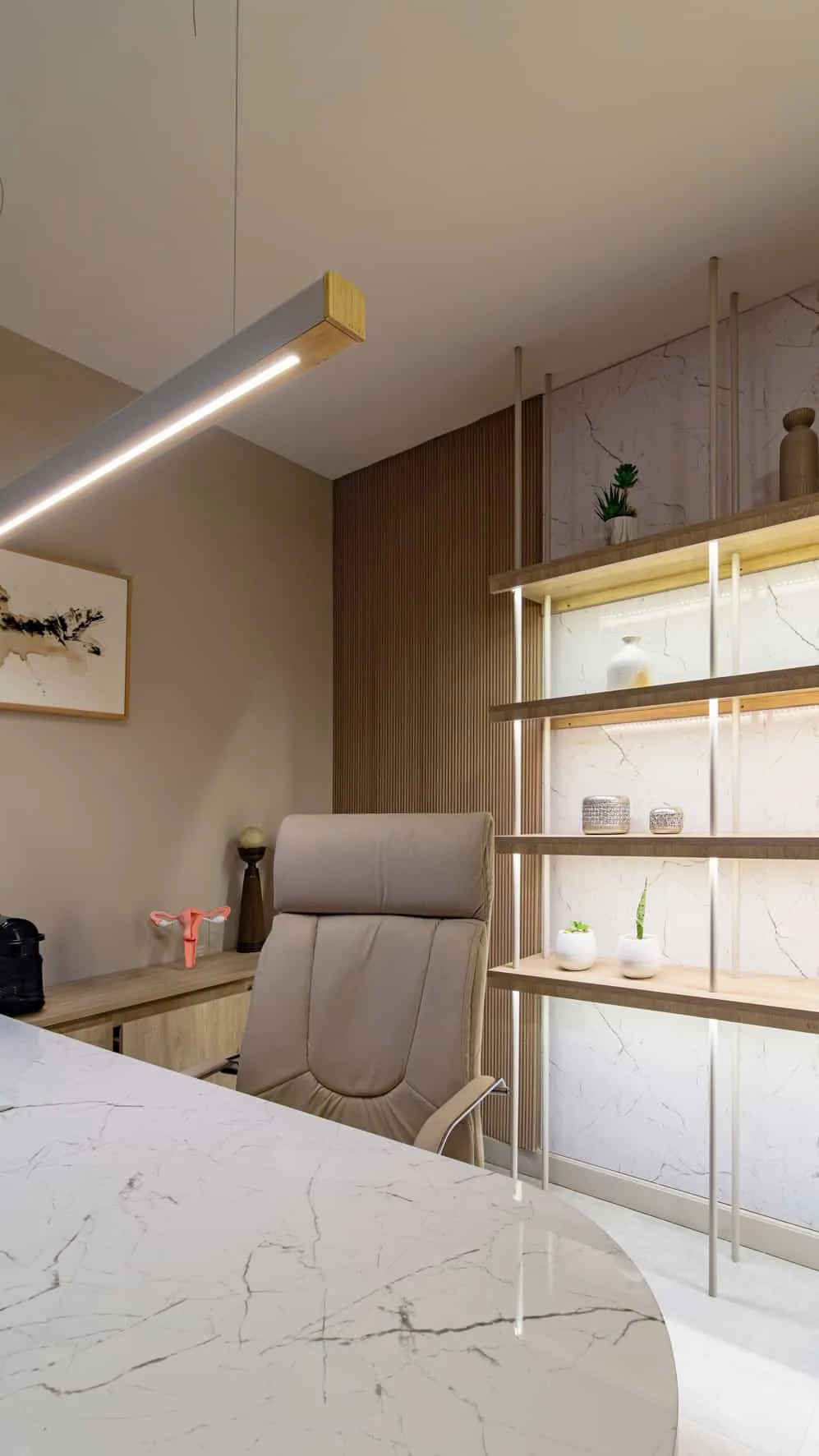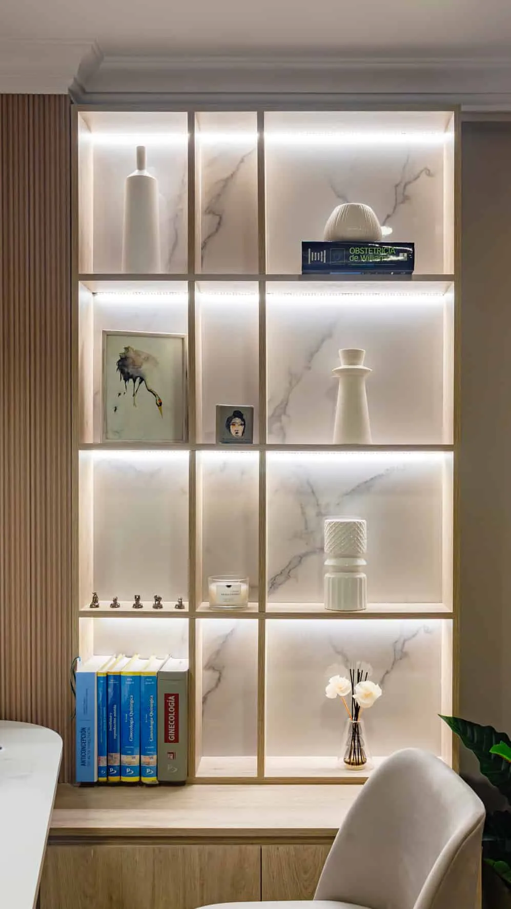 Los consultorios mantienen la misma lógica compositiva. Bibliotecas retroiluminadas integran objetos y libros que aportan una escala más doméstica al ambiente, mientras que los cerramientos livianos de madera y paneles textiles permiten delimitar los espacios sin perder continuidad visual ni calidez material.