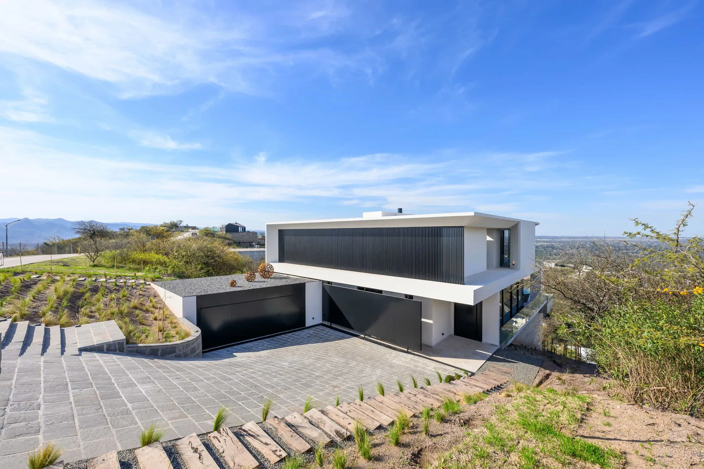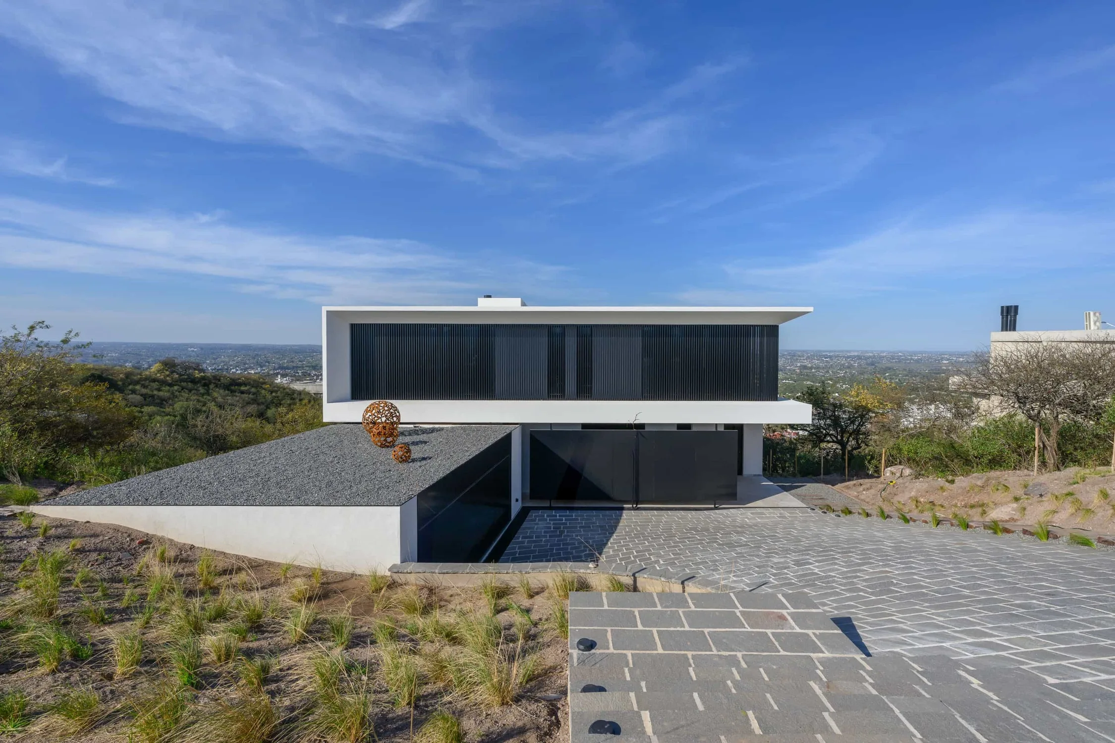 En lo alto de las Sierras de Córdoba, la vivienda se abre hacia el horizonte con una geometría pura que dialoga con el paisaje. Su implantación en pendiente permite una lectura en tres niveles, donde cada planta revela un carácter propio, siempre atravesado por la luz y la materia.