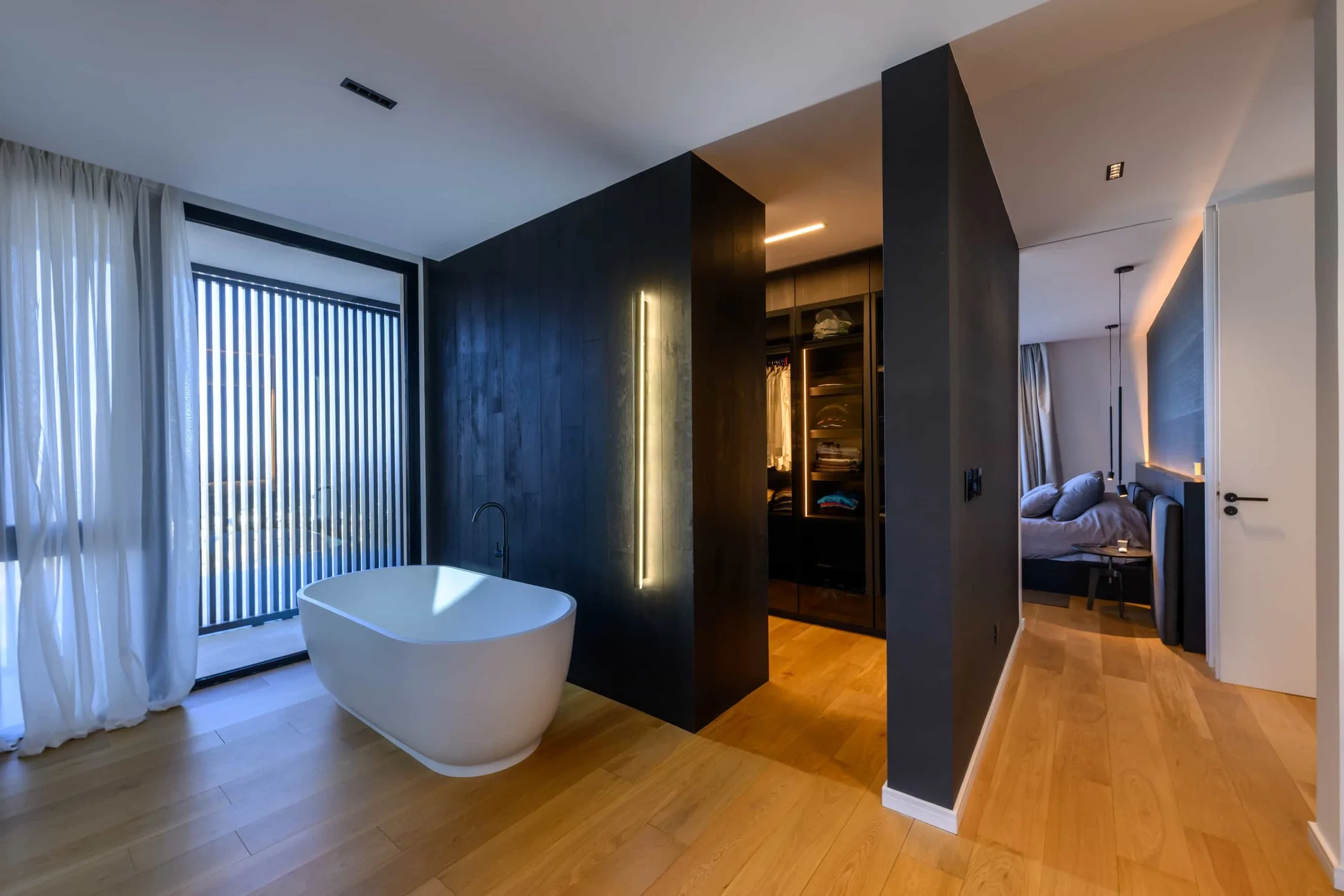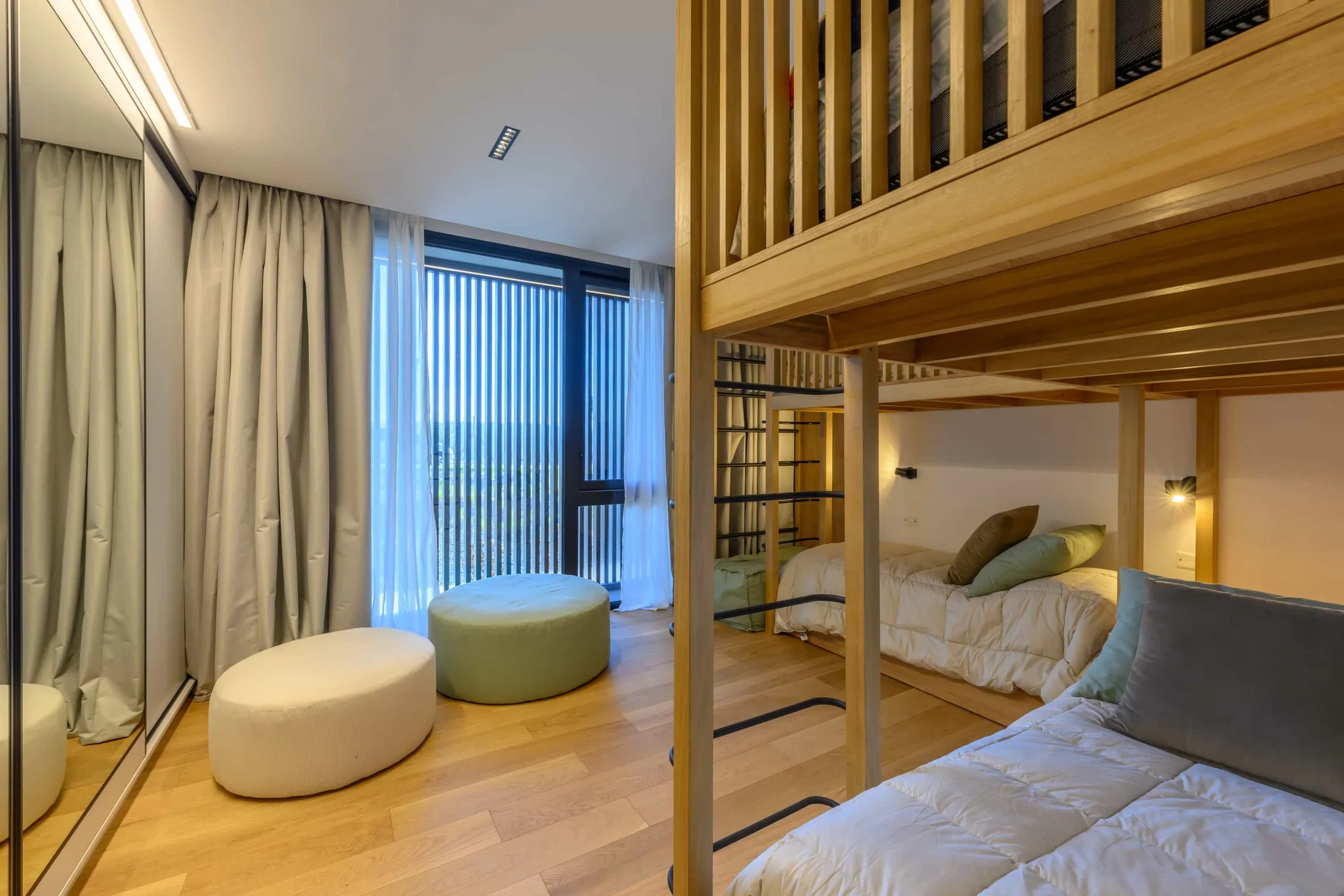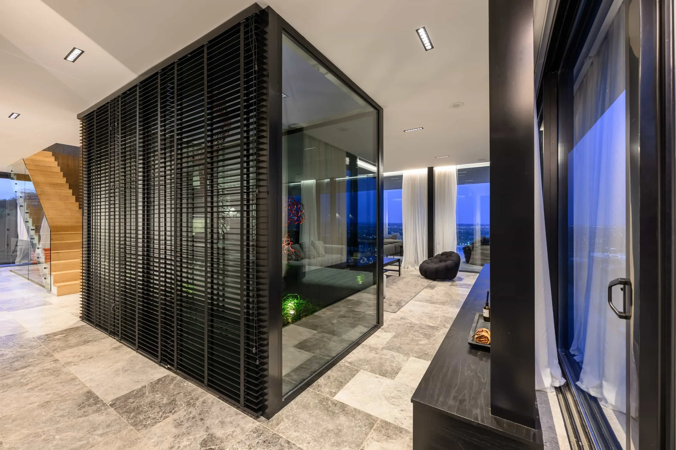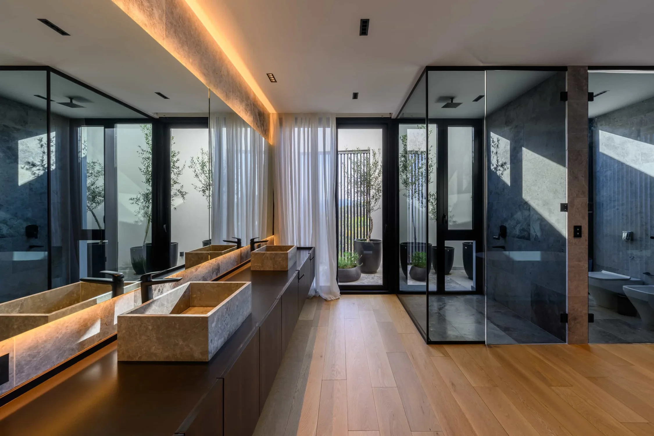 La planta alta alberga el área íntima, donde los dormitorios se abren hacia la vista y la privacidad se regula con celosías metálicas negras que filtran la luz del poniente. El dormitorio principal se prolonga en una terraza íntima, mientras que los baños sorprenden con patios interiores: pequeños jardines enmarcados en vidrio que aportan frescura y luz natural. La madera clara de los pisos suaviza la contundencia del hormigón y la piedra, envolviendo los espacios con calidez.