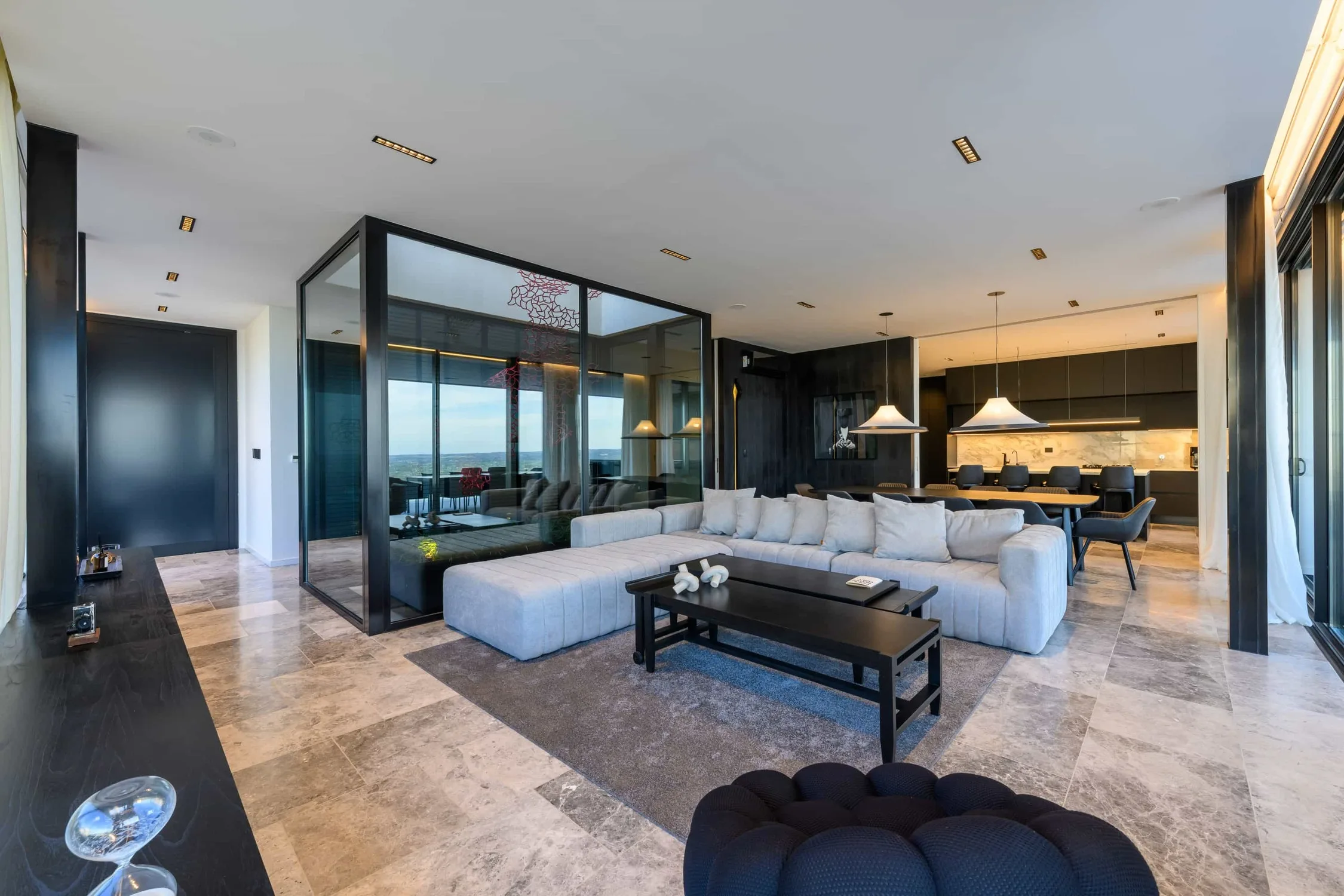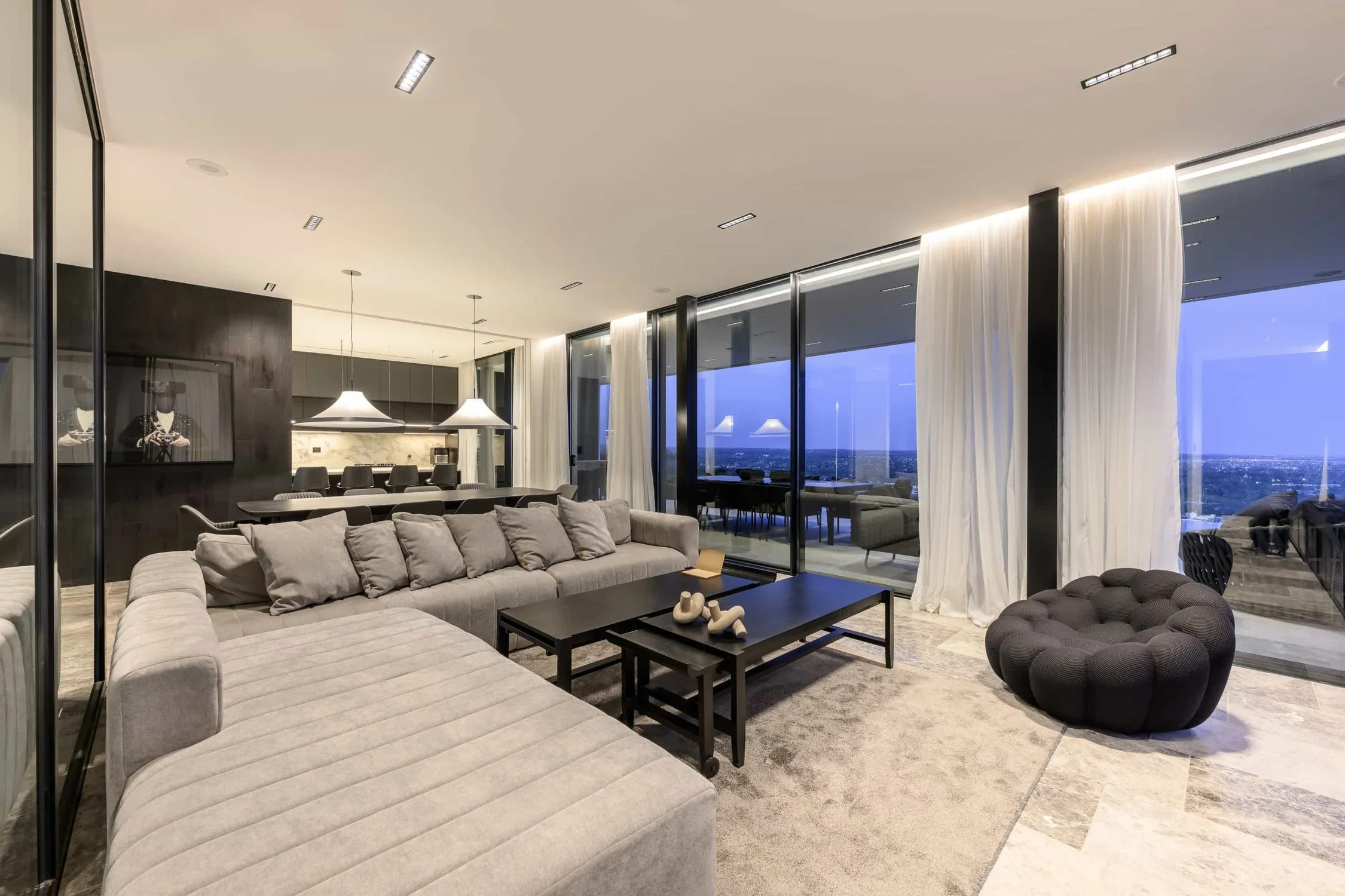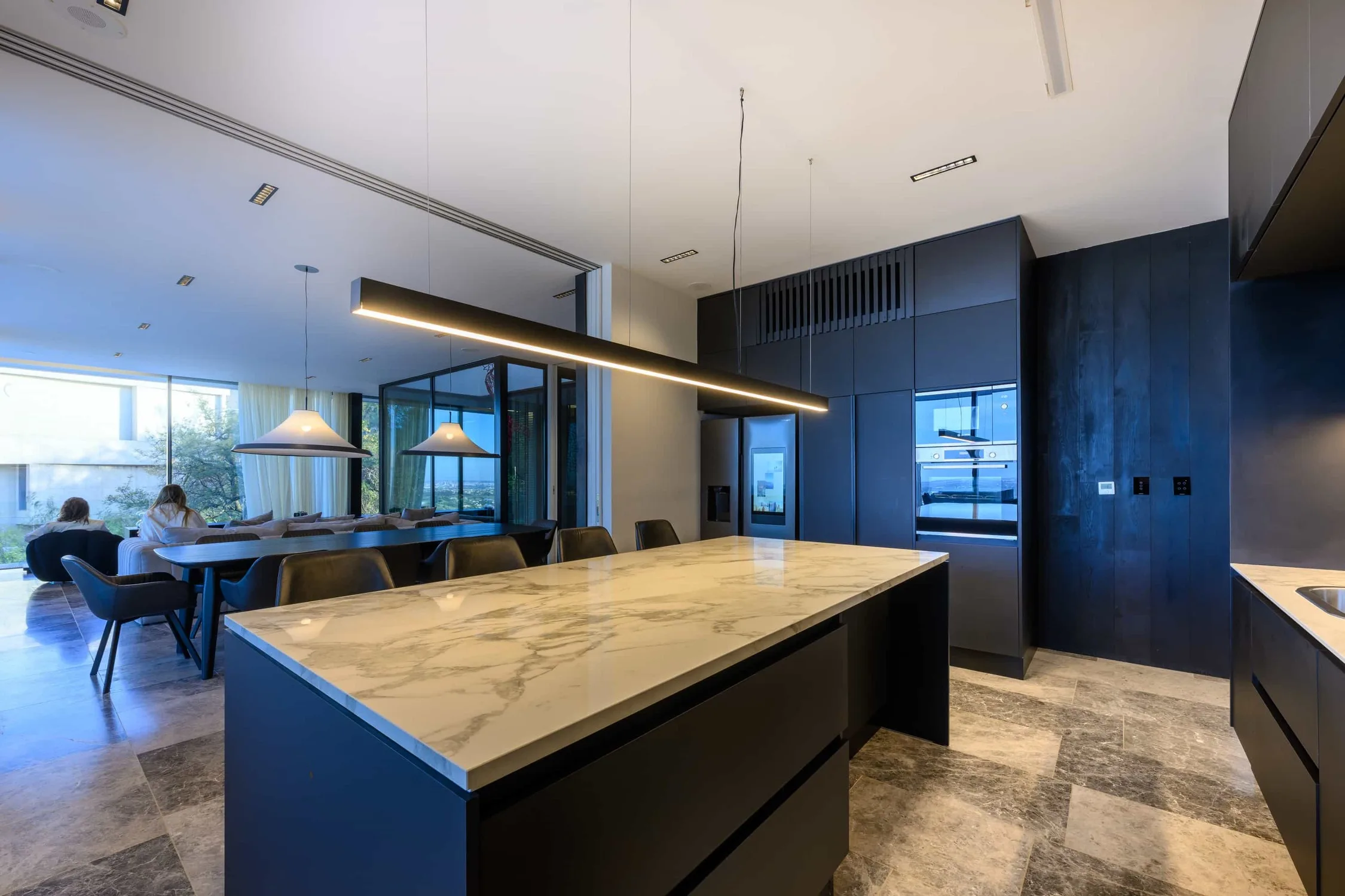 En la planta baja se concentra la vida social: un único espacio continuo reúne estar, comedor y cocina, vinculado de manera directa con la galería y la piscina infinita. El piso de piedra natural conecta interior y exterior, mientras que los grandes ventanales de piso a techo enmarcan la inmensidad del valle. La cocina combina el negro profundo de sus muebles con las vetas blancas del mármol, aportando un contraste elegante que refuerza la sofisticación del espacio. Todo aquí respira amplitud, solidez y transparencia a la vez.