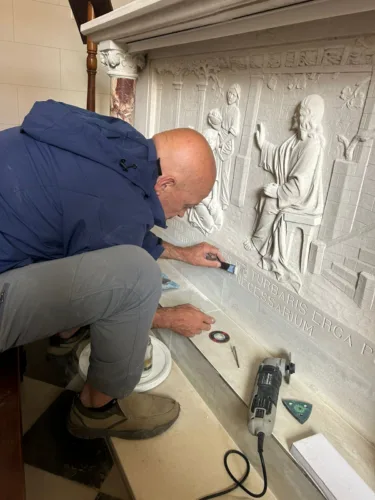 Los fragmentos serán guardados en bolsas de polietileno perfectamente identificadas, en el depósito destinado al efecto. La recolocación se hará fijando las partes mediante un adhesivo epoxi, respetando las indicaciones de fábrica. Se evitará por todos los medios posibles manchar el entorno, ya que este daño será, en la práctica, irreversible. Cuando se requiera se colocarán los pernos de vinculación que faciliten la vinculación entre las partes. En estos casos solo podrán utilizarse materiales inoxidables (acero inoxidable, bronce, vetroresina, etc.).