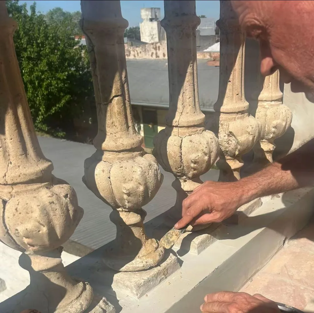 Los premoldeados faltantes serán repuestos empleando piezas de similares características obtenidas por moldeo a partir de las originales existentes en la obra. Serán resueltas en un material similar al de las originales. Se incluirá la provisión de las armaduras de refuerzo que correspondan. En todos los casos se inscribirá en las piezas de reposición una leyenda en bajorrelieve que refiera al año de ejecución (R. 2025), como marca identificatoria de la intervención.